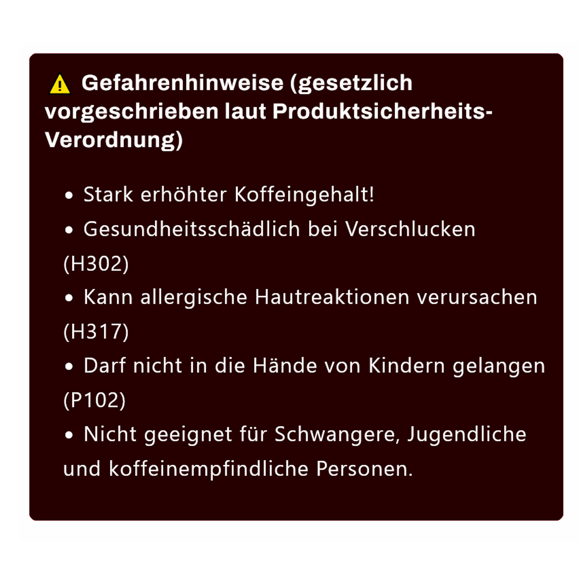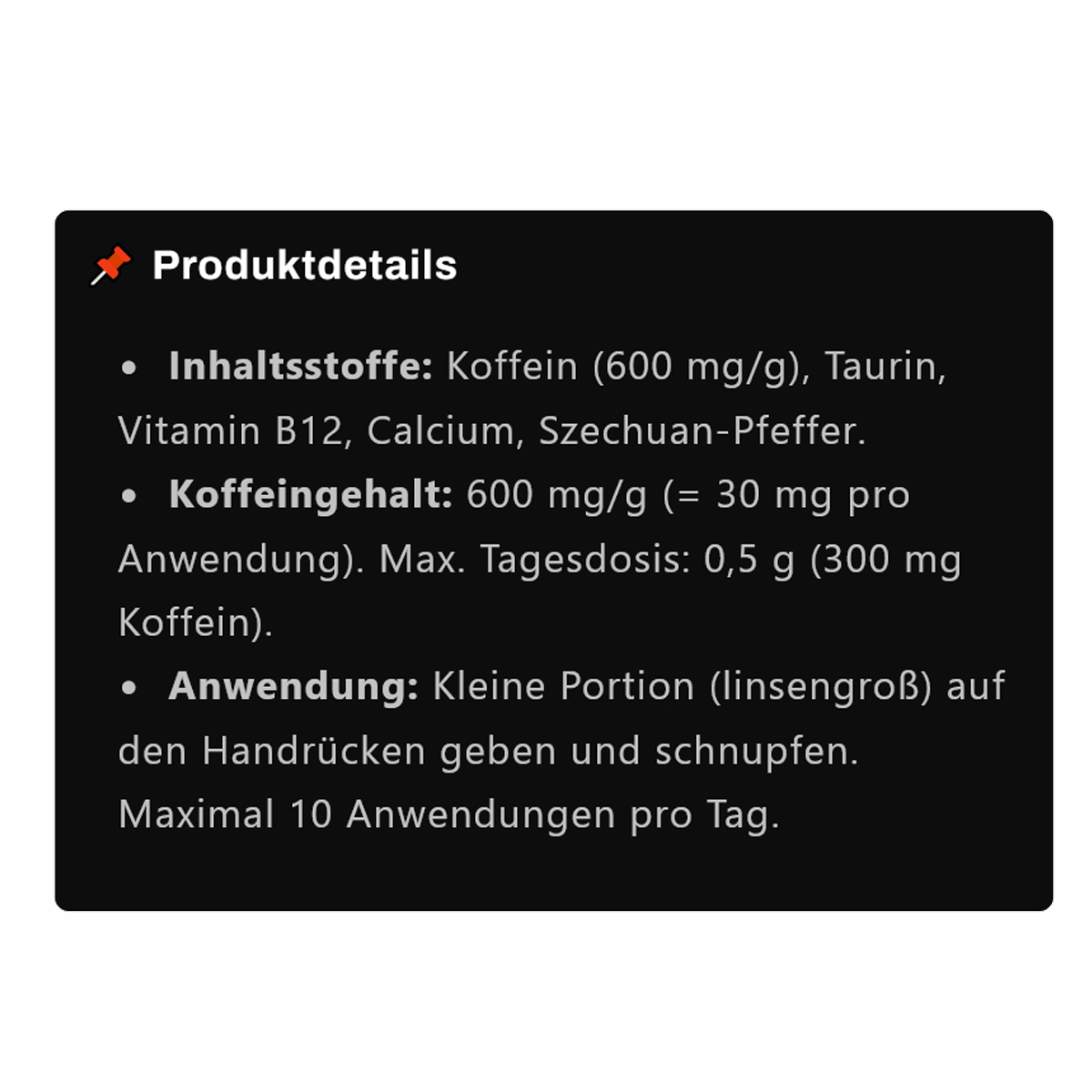 Nicht zum Verzehr über Speisen oder Getränke geeignet. Der Verkauf und Konsum von KOffKAIN ist in der Schweiz legal. Nicht geeignet für Kinder, Schwangere oder koffeinempfindliche Personen.