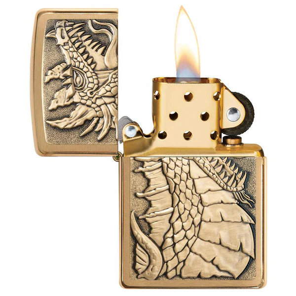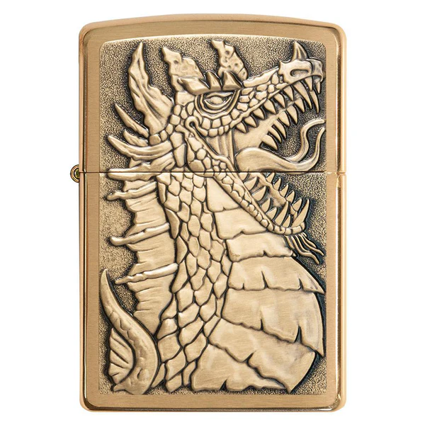 Ein wütender, goldener Drache. Ein furchteinflössendes Chrome Brushed Emblem Zippo Feuerzeug.