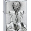 Eine Ladie in einem engen Body öffnet den Reisverschluss. Der Rest in wohl Fantasy. Ein attraktives Chrome Brushed Zippo Emblem Feuerzeug.